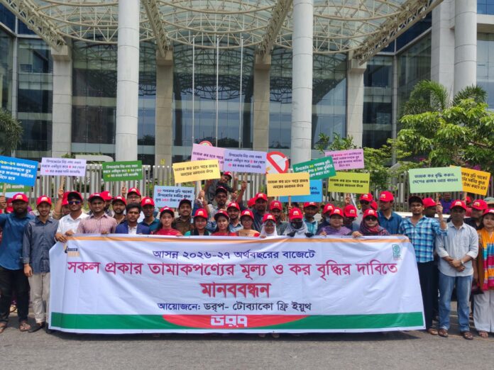 আসন্ন ২০২৬-২৭ অর্থবছরের জাতীয় বাজেটে তামাকপণ্যের উপর কার্যকর করারোপ ও মূল্য বৃদ্ধির দাবি জানিয়েছে ডর্প টোব্যাকো-ফ্রি ইয়ুথ-এর সদস্যসহ বিভিন্ন বিশ্ববিদ্যালয়ের শতাধিক শিক্ষার্থী। সিগারেটের সহজ প্রাপ্যতা কমাতে এবং তামাকের ক্ষতি থেকে তরুণ সমাজকে রক্ষায়, শনিবার (২৫ এপ্রিল ২০২৬) সকালে আগারগাঁও জাতীয় রাজস্ব ভবন-এর সামনে আয়োজিত এক মানববন্ধনে এই দাবি জানান তরুণরা।
