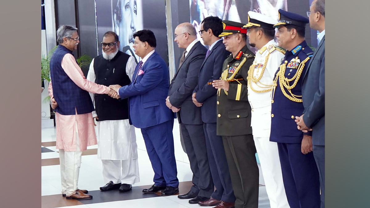 এসময় মুক্তিযুদ্ধ বিষয়ক মন্ত্রী আ. ক. ম. মোজাম্মেল হক, পররাষ্ট্রমন্ত্রী ড. এ কে আব্দুল মোমেন, কূটনৈতিক কোরের ডিন, তিন বাহিনীর প্রধান, পুলিশ মহাপরিদর্শক এবং সামরিক ও বেসামরিক-সামরিক ঊর্ধ্বতন কর্মকর্তারা রাষ্ট্রপতি সাহাবুদ্দিনকে স্বাগত জানান।