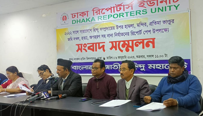 রাজধানীর ঢাকা রিপোর্টার্স ইউনিটিতে (ডিআরইউ) আয়োজিত এক সংবাদ সম্মেলনে এসব তথ্য জানায় বাংলাদেশ জাতীয় হিন্দু মহাজোট। শুক্রবার (৬ জানুয়ারি) আয়োজিত সংবাদ সম্মেলনে লিখিত বক্তব্য পাঠ করেন সংগঠনের মহাসচিব গোবিন্দ চন্দ্র প্রামাণিক।