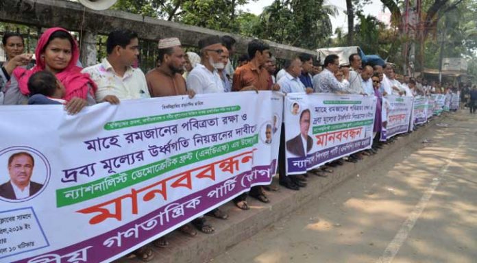প্রতি বছর রমজান মাসকে সামনে রেখে কিছু অসাধু ব্যবসায়ী দ্রব্যমূল্য বাড়িয়ে দেন। এতে নিম্ন ও মধ্য আয়ের মানুষের ক্রয় ক্ষমতার বাইরে চলে যায় নিত্যপণ্যের দাম। এ বিষয়টি মাথায় রেখে আসন্ন রমজানের আগেই বাজার মনিটরিং জোরদারের দাবি জানিয়েছে ন্যাশনালিস্ট ডেমোক্রেটিক ফ্রন্ট (এনডিএফ)। শনিবার (২০ এপ্রিল) জাতীয় প্রেসক্লাবের সামনে এক মানববন্ধনে এমন দাবি জানায় এনডিএফ।